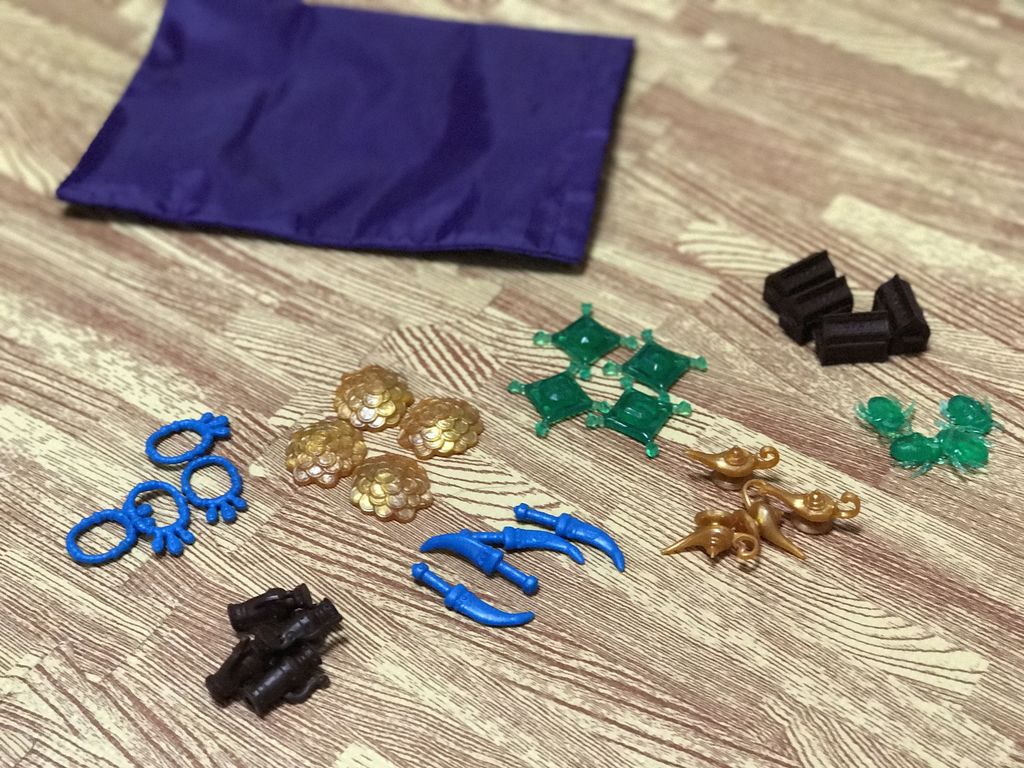 ランプとか曲刀とか。アラビアンなデザインです。右端の緑のは、息子は『カブトムシ』って呼んでいましたが、多分スカラベですね。七色に光るフンコロガシ。