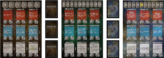 宇宙船コマが、最初に裏向きの遭遇カードに到達したときに行われるイベントです。遭遇カードを表向きにして、そのプレイヤーの遭遇マーカを置いて勝利点を得ます。その後、遭遇カードの<公開時>と書かれた効果を適用します。