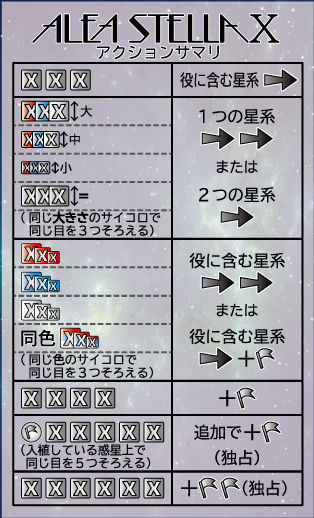 保持した出目を組み合わせて「役」を作り、「星系を探査する」「惑星に入植する」などのアクションを行うことができます。複数の役を作ることができる場合は、それらの役で複数のアクションを行うことができます。ただし、1度アクションに使用した出目を別のアクション用の役に組み込むことはできません。