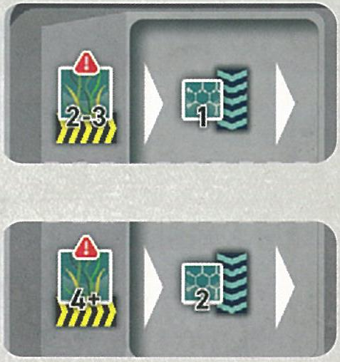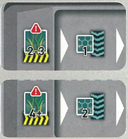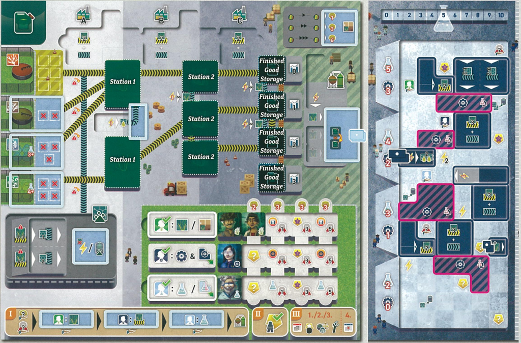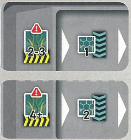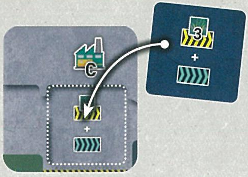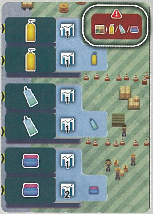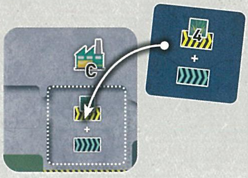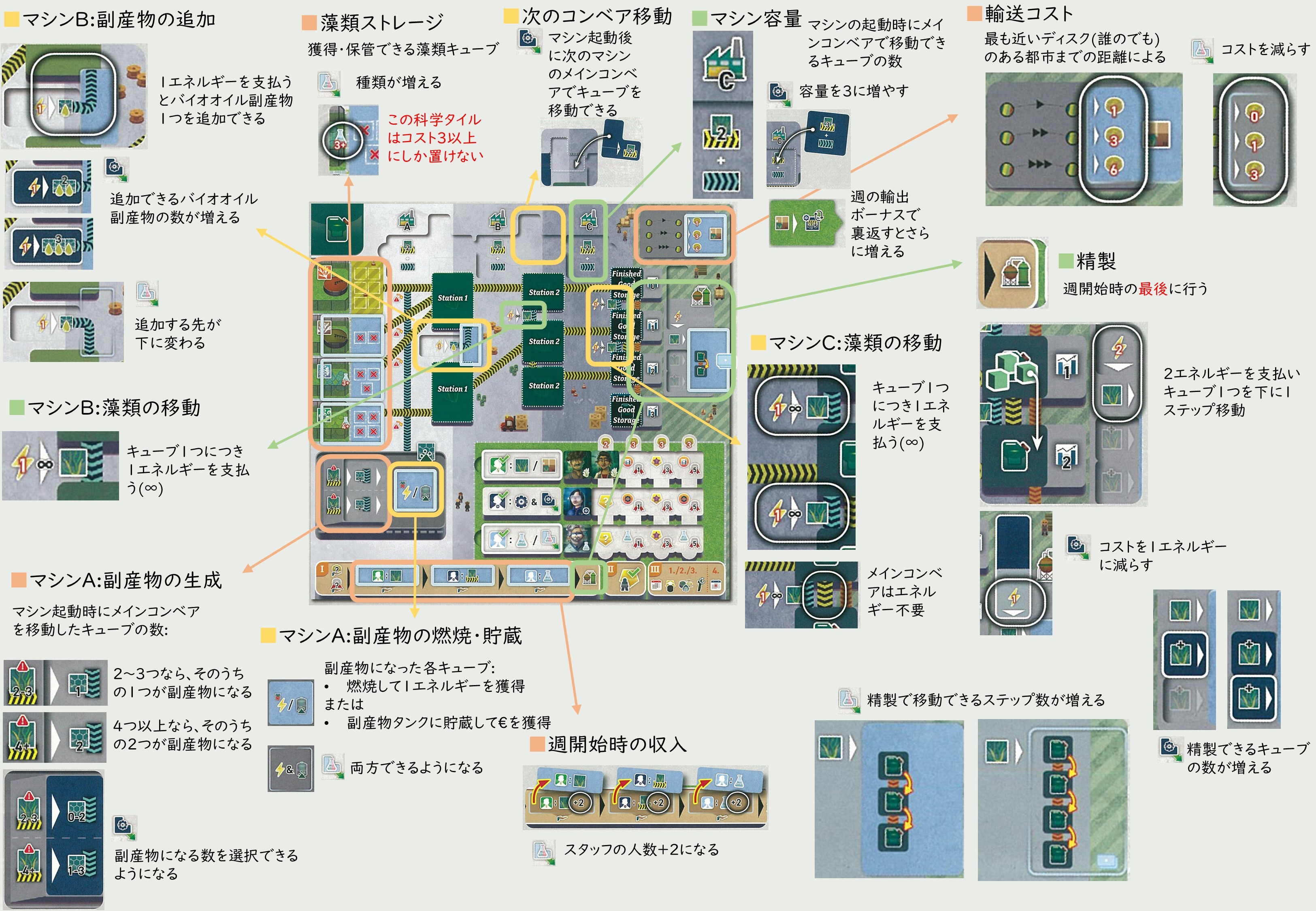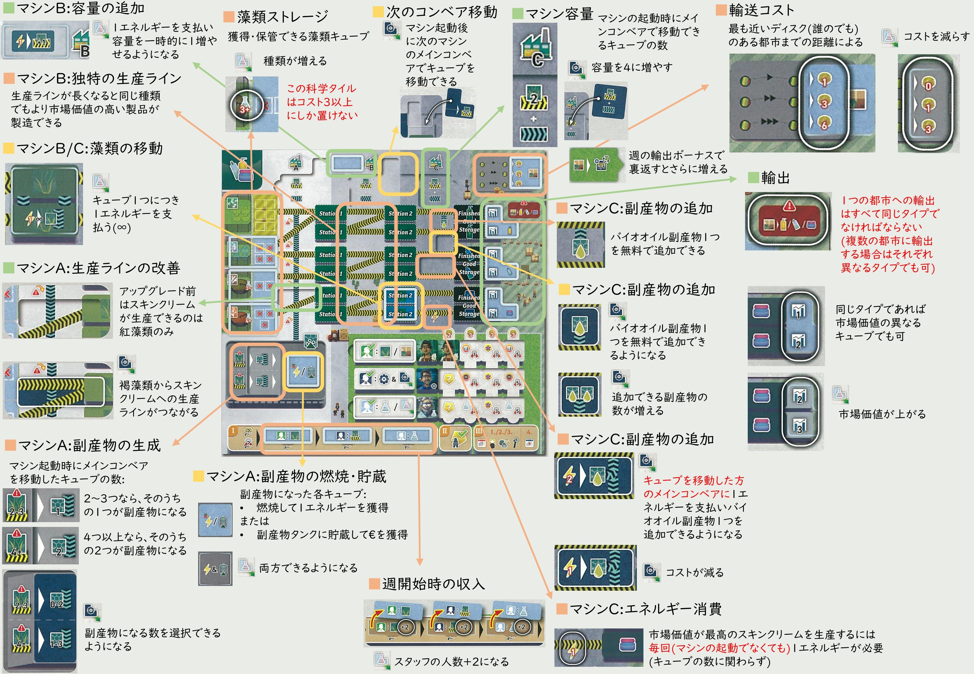 科学者アクションによって取り除くことで、隠されていた機能が解放され、工場がアップグレードされます。取り除いたタイルはサイドボードに配置し、即時ボーナスと終了時得点を得ることができます。 |