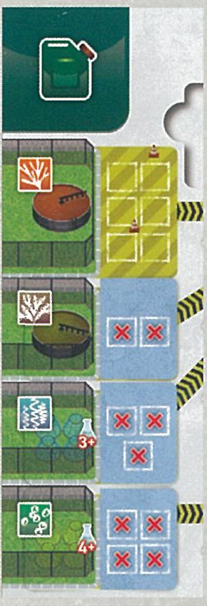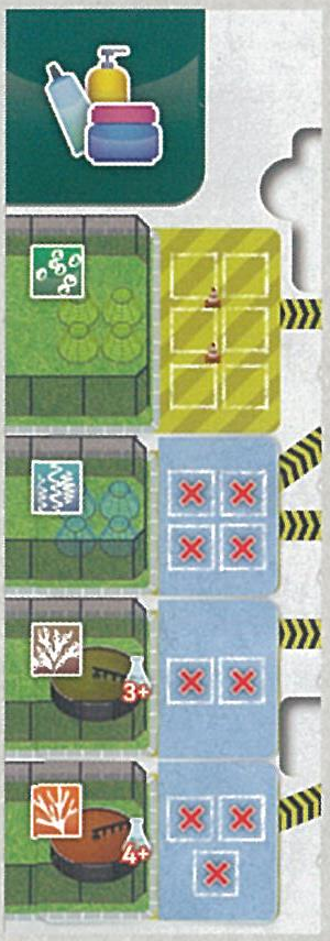 藻類は4種類あり、それぞれ別のストレージに保持します。ゲーム開始時に使えるストレージは1つだけで、他3つは科学タイルによって塞がれており、科学者アクションで取り除く必要があります。