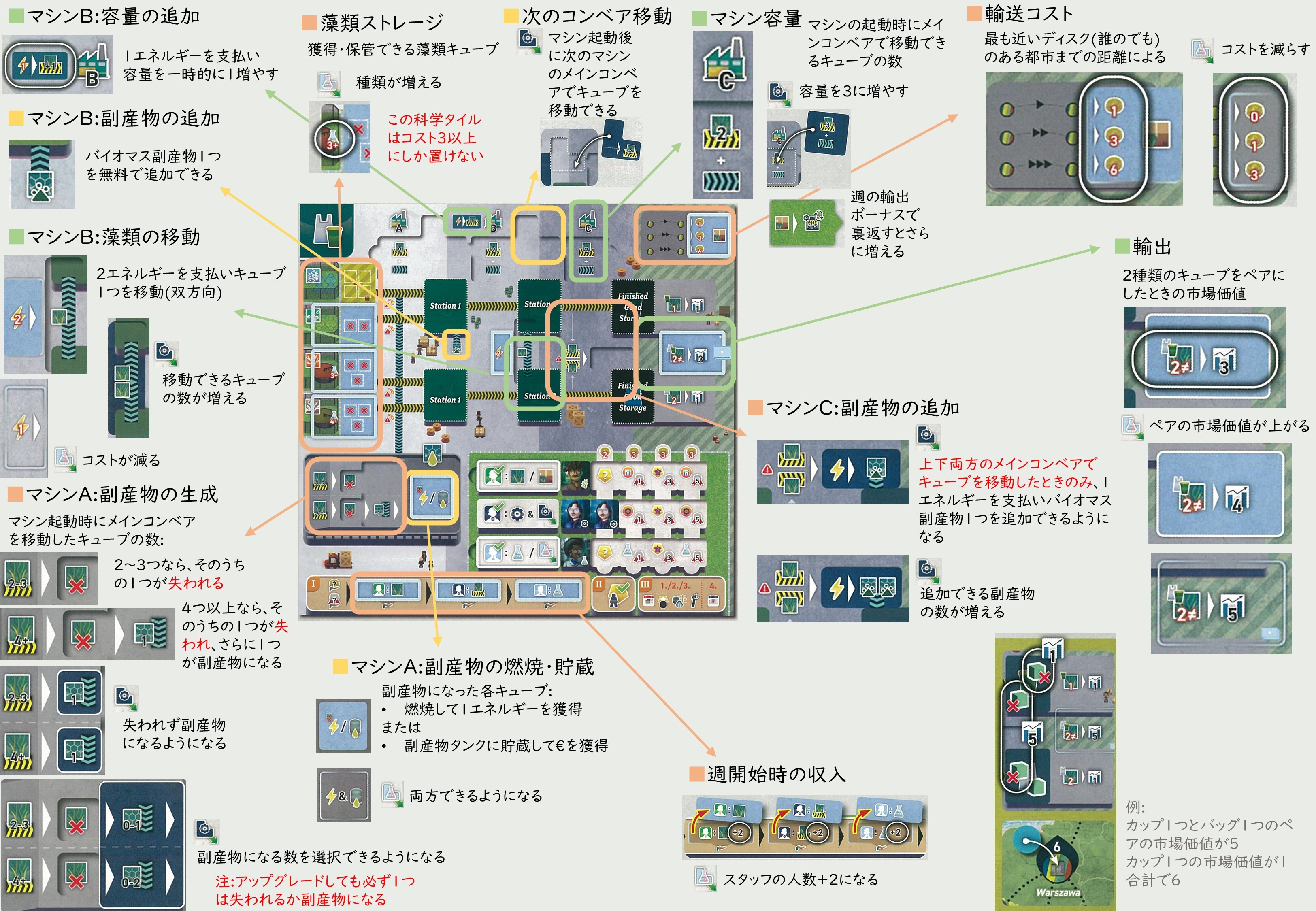 注:Algae Inc.を数回プレイし、通常のセットアップに慣れた後は、4つの両面の科学インレイをプレイヤー間でランダムに配布して、ゲームをさらにバラエティに富ませることができます。