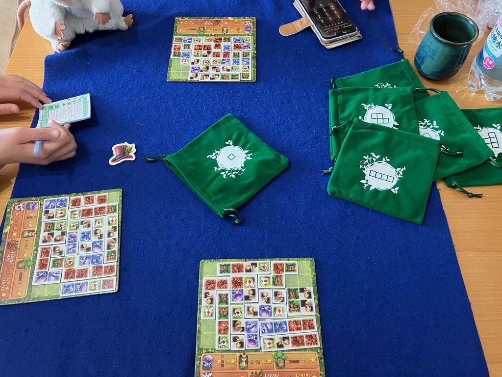子供は、乗数で増えていく「バラ」の5マスコンプリートや、真ん中列に置けば点数になる「チェス」あたりを目掛けて一直線なので、なるべく邪魔しないようにしながら、「木」でなるべく点がでるように散らしていると、気づいたらタイルでハマるのがなくなっていたりして、その後は最後ピッタリで収まるようにも配慮したり、まあいろいろ気をつけなきゃいけないので、シニアも頭の体操に是非。