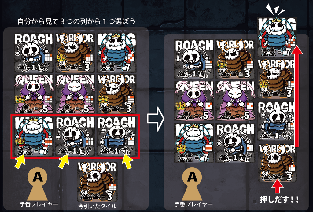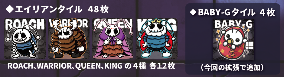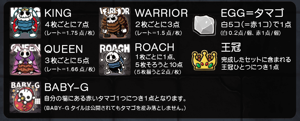 ①このゲームには、KING、QUEEN、WARRIOR、ROACH、BABY-Gの5種類のタイルがあり、