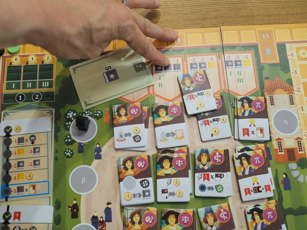 6枚のセットアップカードを引く。3枚を選びプレイヤーが取る。残り3枚を敵Aに与える。新たに3枚を引き敵Bに与える。各人のカード上の数字の合計で、プレイ順を決める。同点のときは自分が後番になる。敵A・Bのセットアップカードの研究ポイントと名声ポイントを、すべて敵Aに与える。敵A・Bのセットアップカードの本・金貨・学生は無視する。
