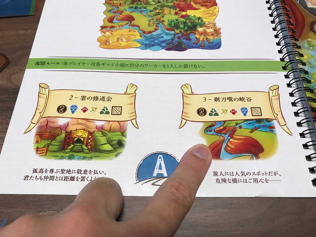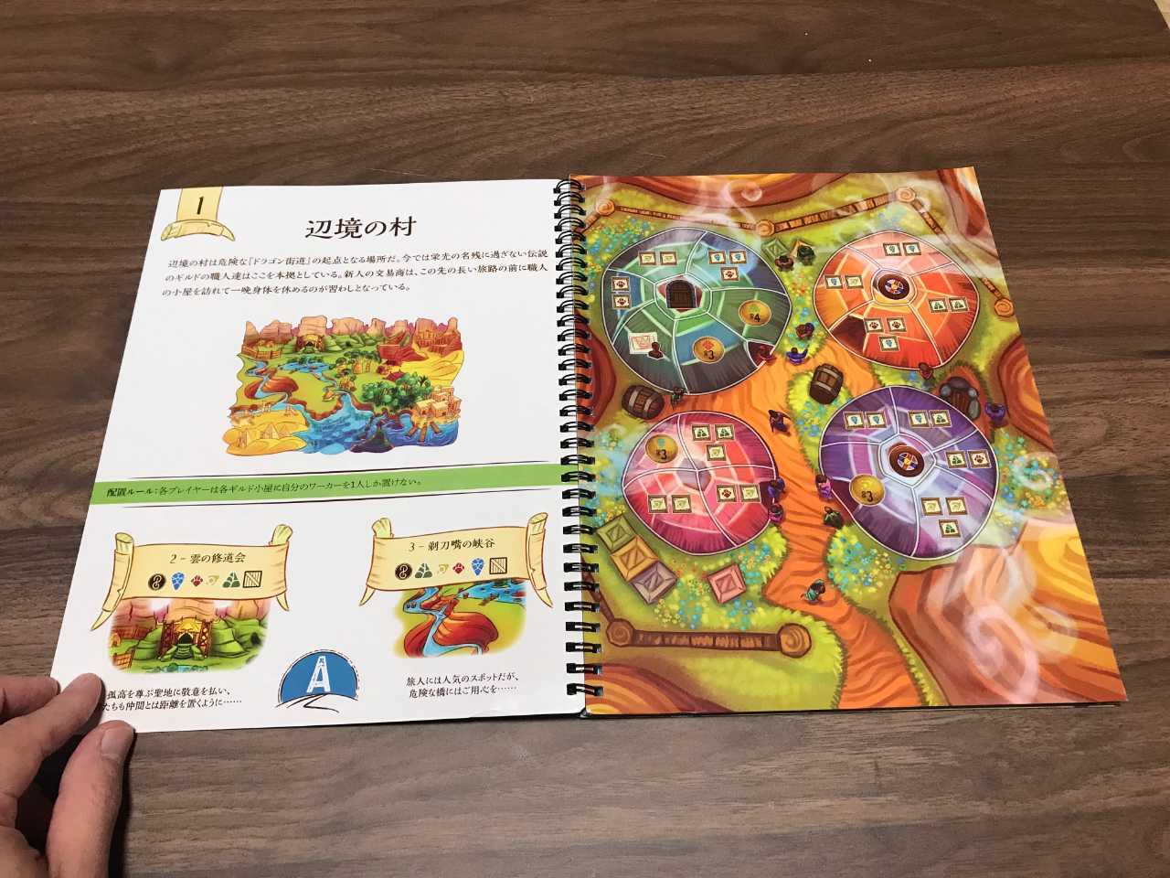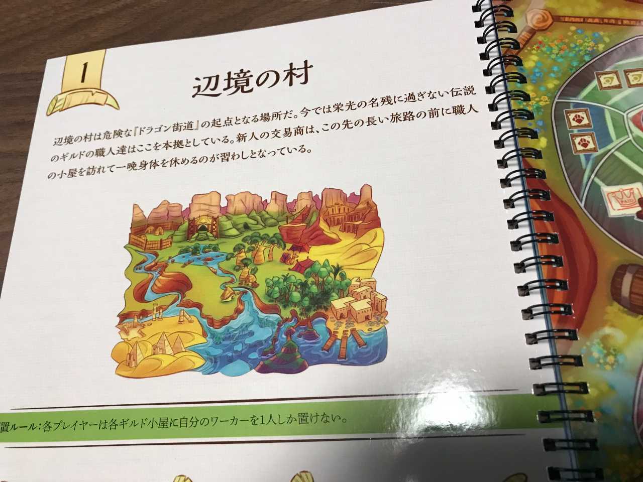 各ページには、村の説明と共に、そのラウンド特有のワーカープレイスメントのルールが書いてあります。これがこのゲームの特徴であり面白いところで、ラウンドごと(村・町ごと)に違うルールでワカプレをするのです。郷に入っては郷に従え!ということですね。