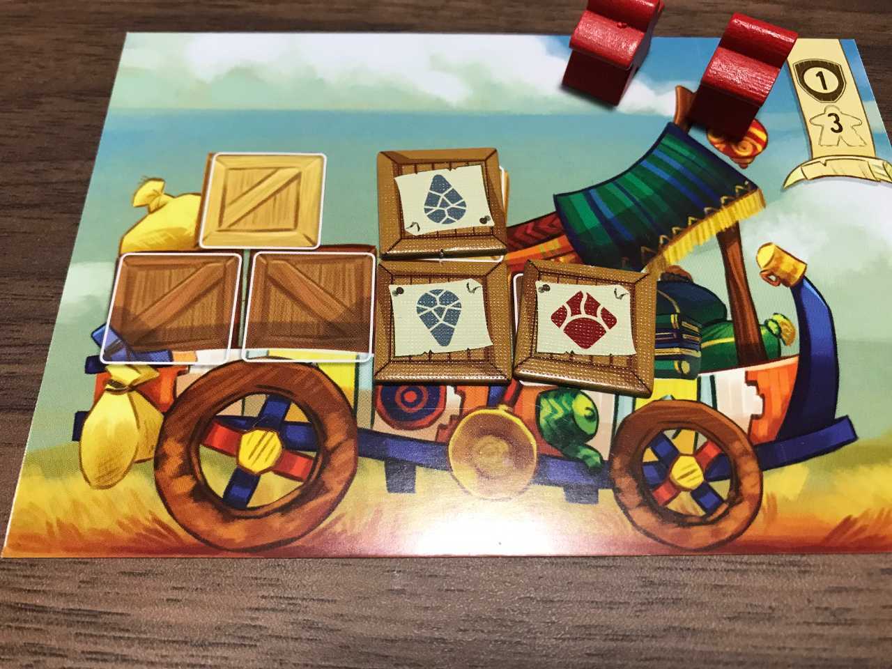 プレイヤーは、初期ワーカー3つと、最大6個の商品を載せられるキャラバンを持っています。これで商品を積んだり、売ったりするわけです。