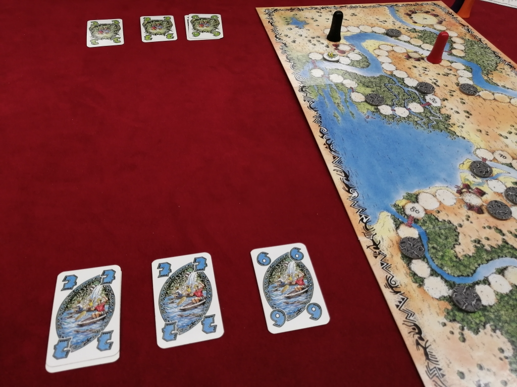 手元にあるカードを重ねて一番合計値が大きい色の数だけコマを進める。ゲーム開始時に秘密裏にチップを配置しており、チップに止まると表向きにして効果を発動。