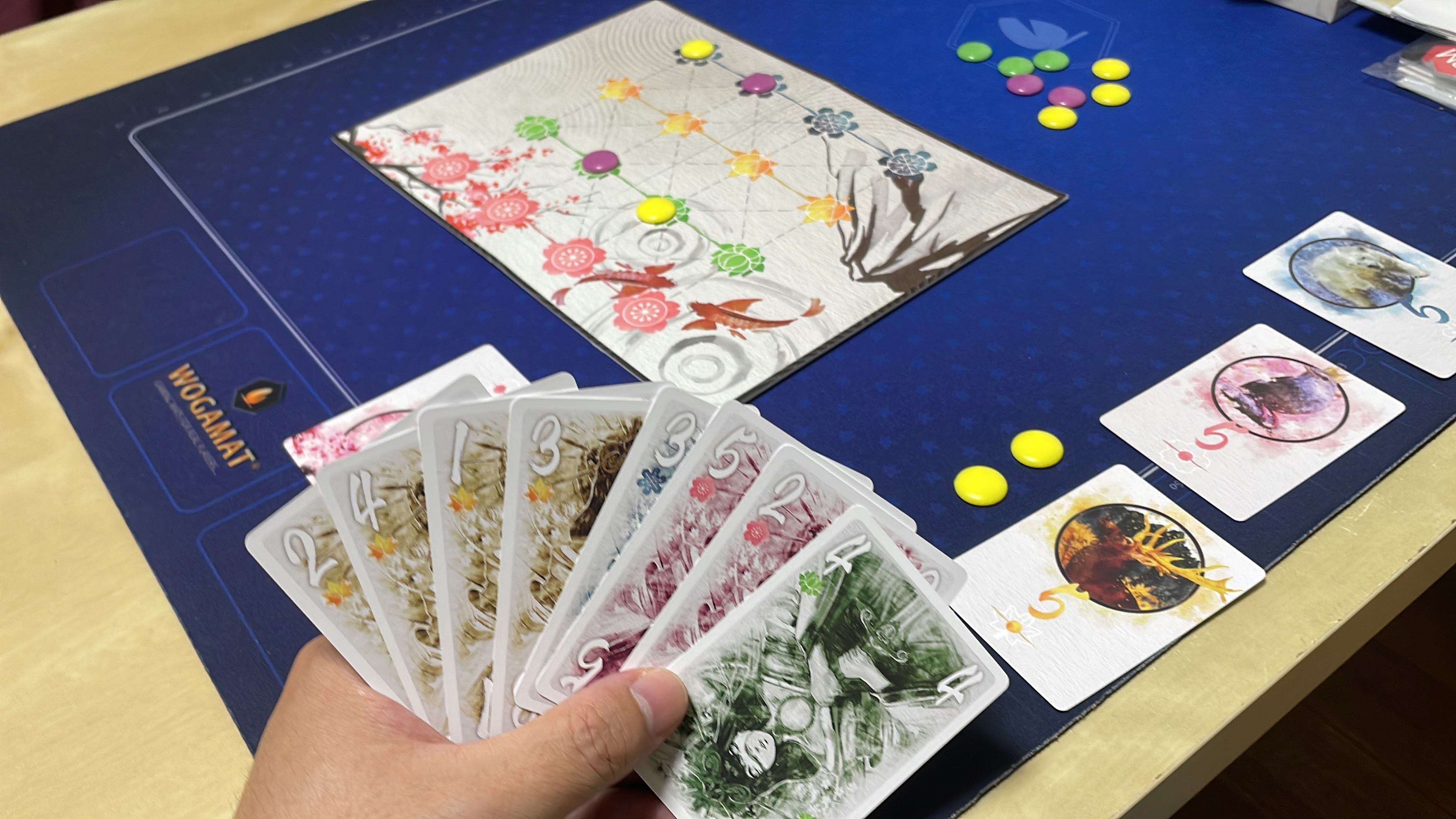 トリックテイキングと陣取りを行う、四季をテーマにしたゲームです。2ラウンドで合計得点を競います。