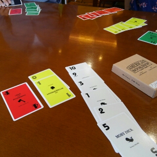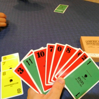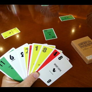 カウントアップ式のトリックテイキングで、獲得したくない色が混ざってきたらどうするかや出せる時に大きい数字か小さい数字のどちらを出すかにと悩ましい。ルール説明で「おっ?」となってもらえて、遊んでも好評なトリテでした。