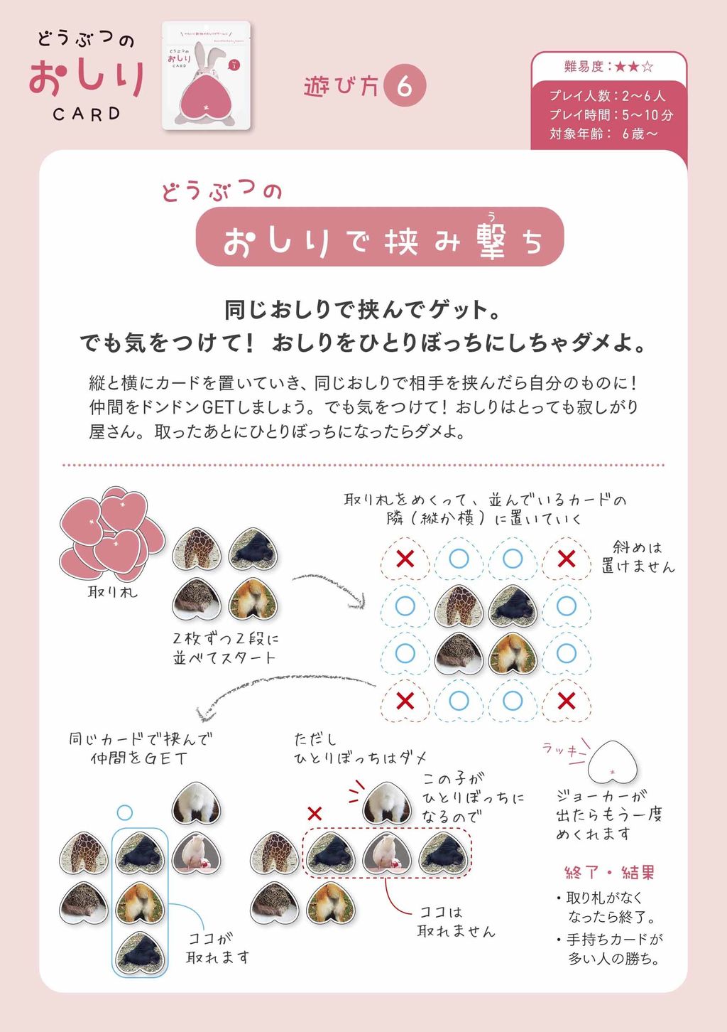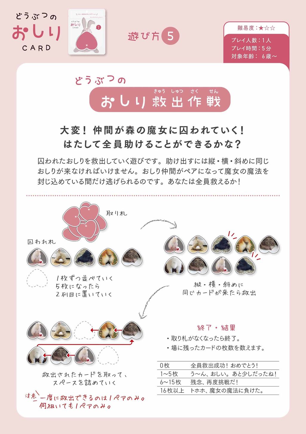 「どうぶつのおしりならべ」は、「どうぶつのおしりCARD」のいろいろな遊び方の中で、卓上に全種類のかわいい動物のおしりがズラリ並んで、動物好きにはたまらない遊び方。ルールは簡単・シンプルながら、カードを出す順番を考えたり、ちょっぴりいじわるしたりといった駆け引きも楽しめます。