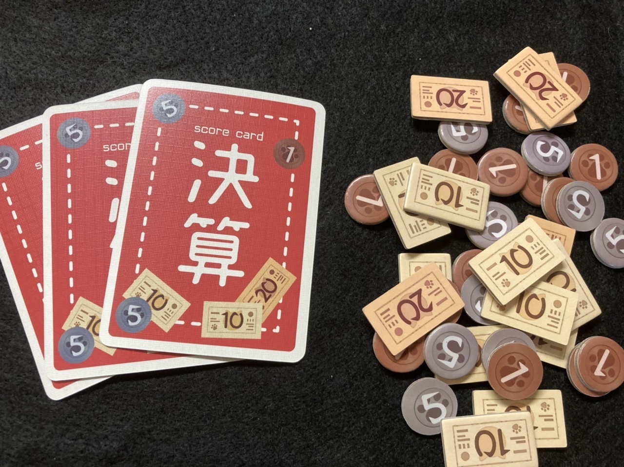 受け取った産物は種類ごとにずらして重ねていきますが、そこには0~2の数字が書いてあって、『一番上に重ねた数字×枚数』が点数になります。