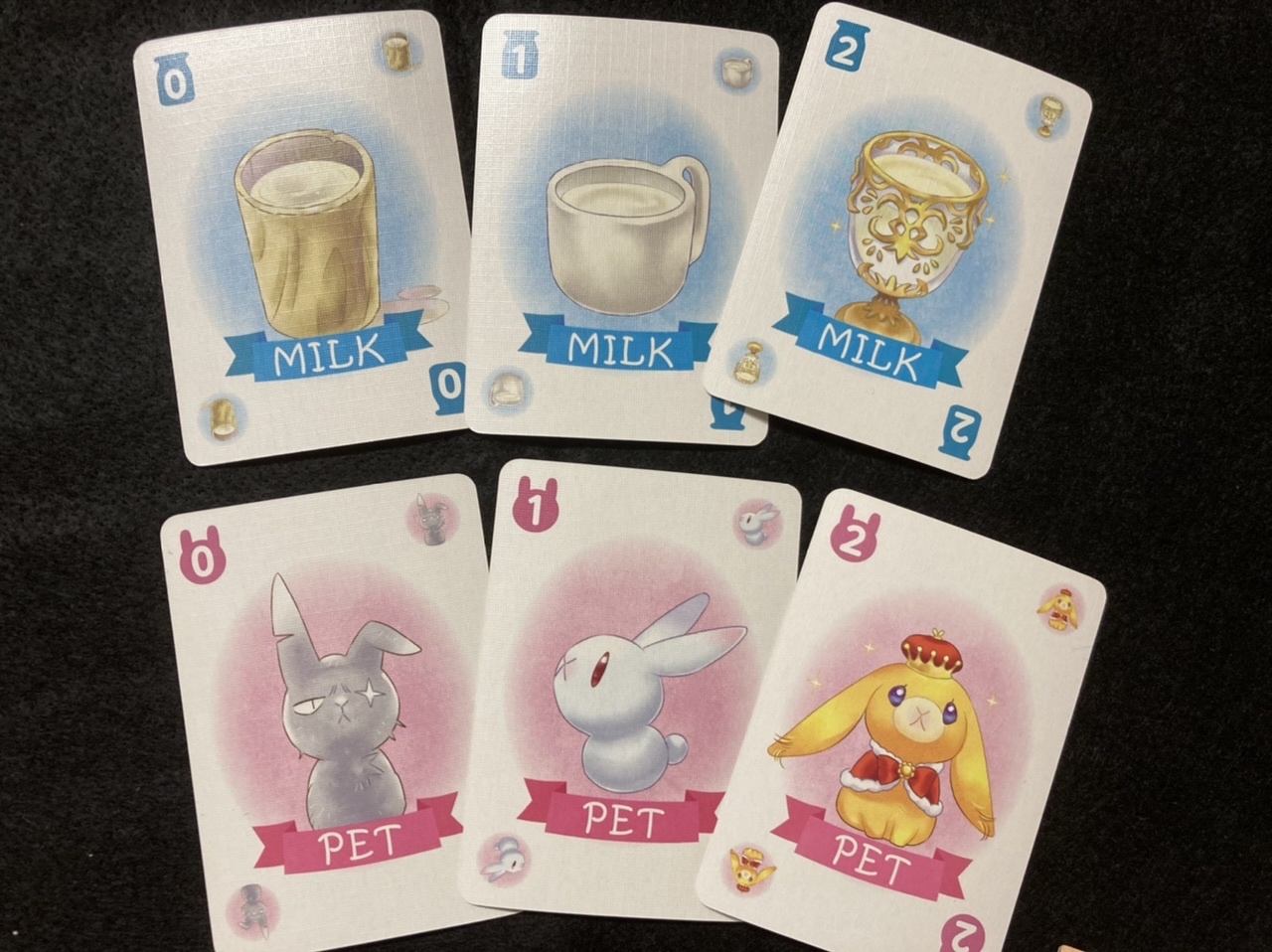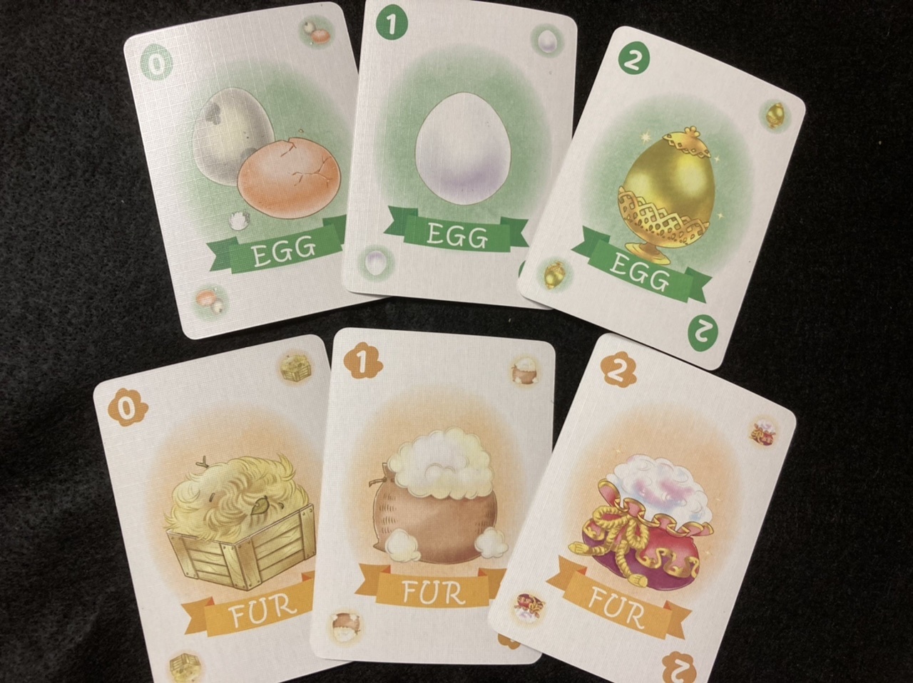 このゲームは、自分がめくったカードの産物(ペット、タマゴ、毛皮、ミルクの4種類ね)を誰か指名して贈与?します。(カードを伏せた状態で、差し出すわけですね。)