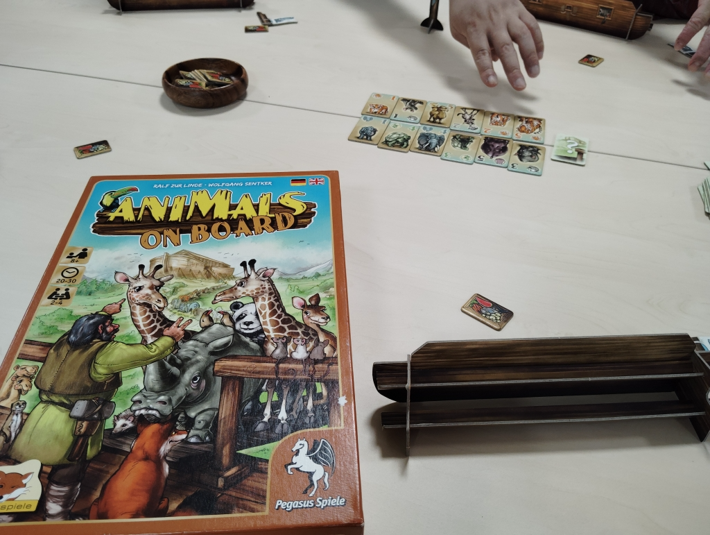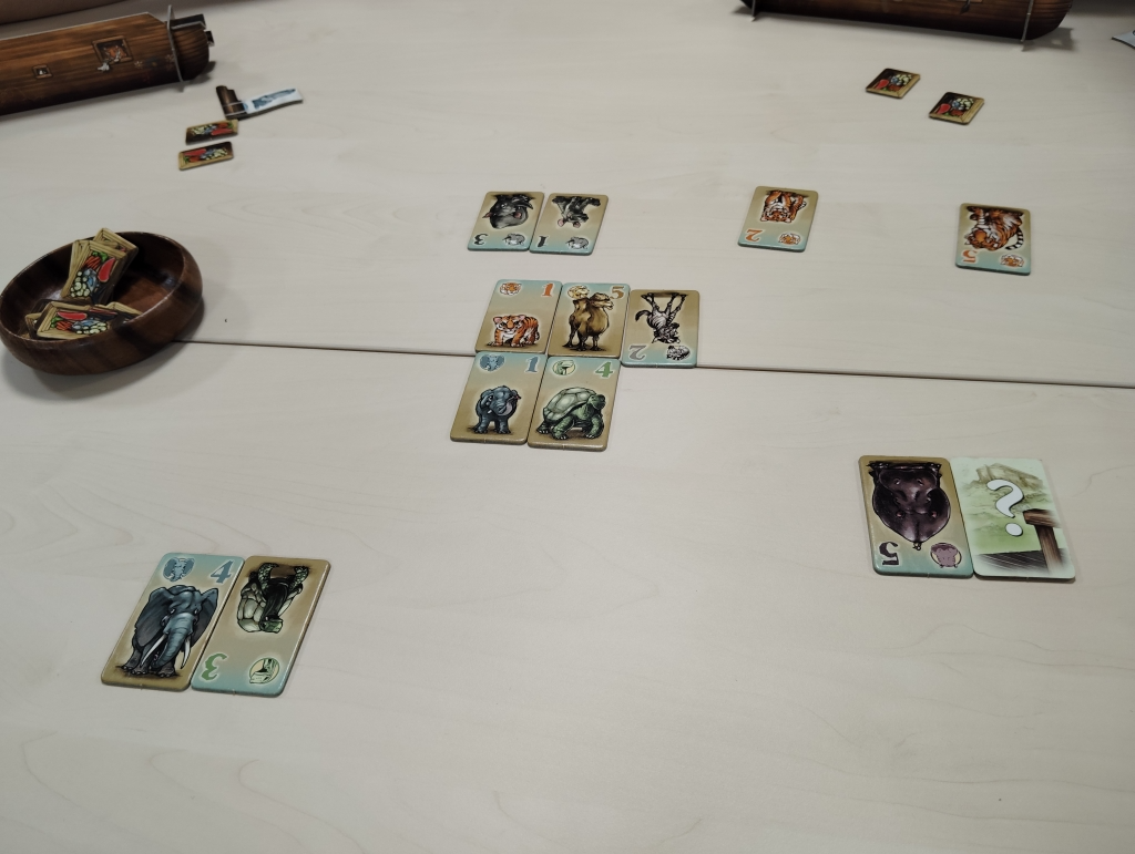 誰かが10枚以上の動物を招き入れていたらゲーム終了で、まずは同じ種類で2枚だけの動物がいないかを確認して、2枚ぴったりならカップル成立で旅立ちます。