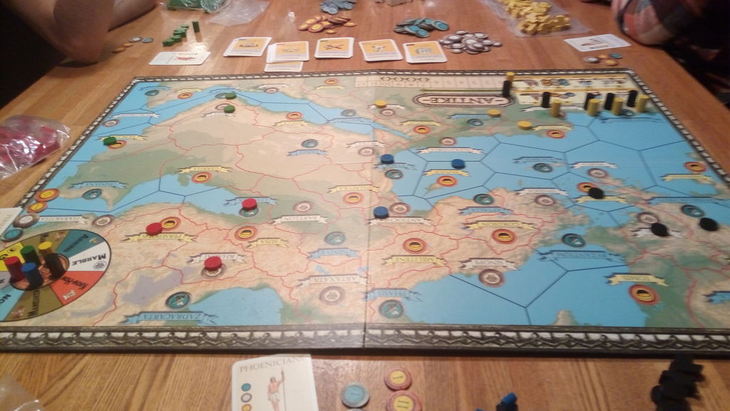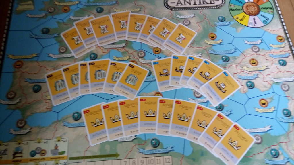 まず、あっというまにボードは埋まります。しかし、中盤までは、領地を接している同士の小競り合いはあれど、やはりロンデルのジレンマにじりじりしながら、技術開発や神殿建設といった、比較的平和な達成カードがとられていきます。