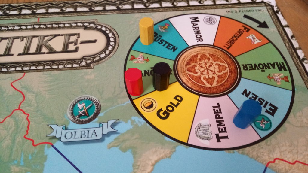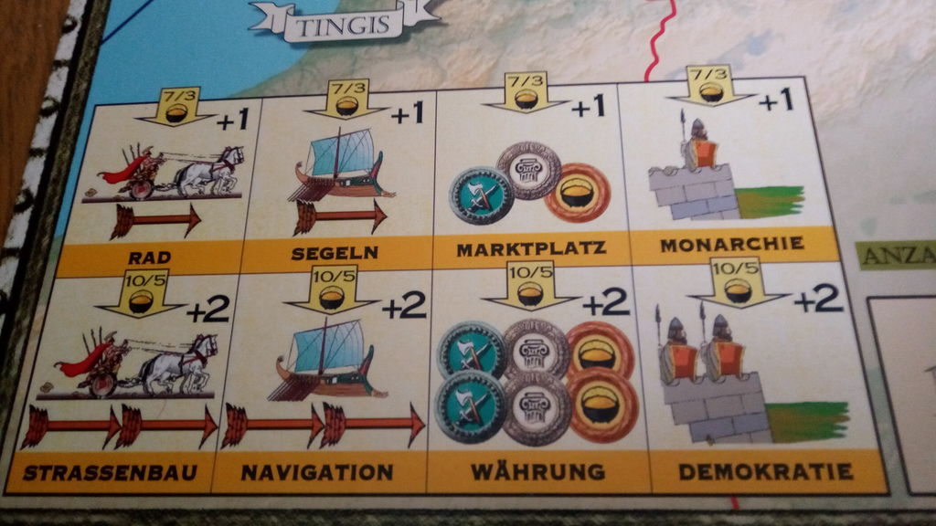 例えば、このゲームでは、金(Gold)、鉄(Eisen)、大理石(Marmor)という3種類の資源が生産されます。しかし、これらの資源を使うアクションは、資源生産マスからちょうど4マス離れています。無料で進めるのは3マスまでなので、例えば鉄を生産して次のターンにすぐ軍隊をつくろうと思っても1コインが必要です。鉄を生産した後に、(鉄を使う)軍隊生産を急ぎすぎると、神殿建築や、金の生産ができません。同様に、大理石をとった後に(大理石を使う)神殿建築を急ぎすぎると、技術発展や鉄の生産が遅れます。