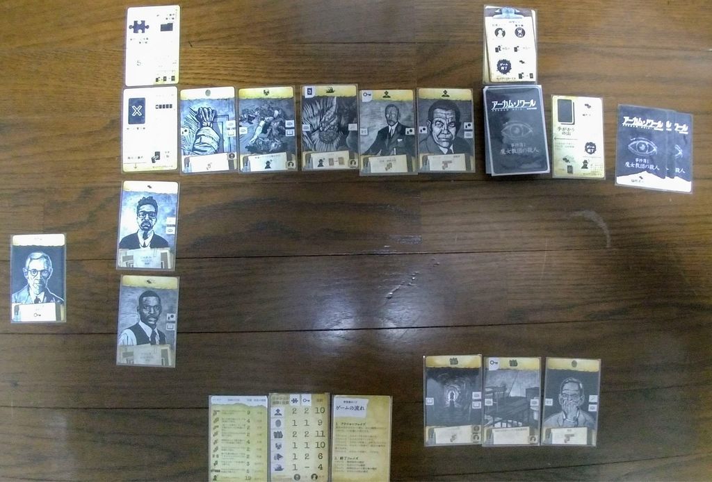 3)ゲーム敗北条件:狂気エリアにカードが5枚以上並ぶ。叉はパズルピースカードを5枚集める前に、犠牲者カードが無くなる。