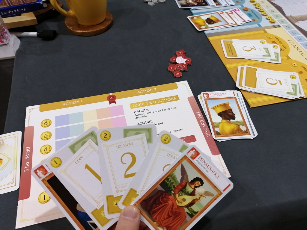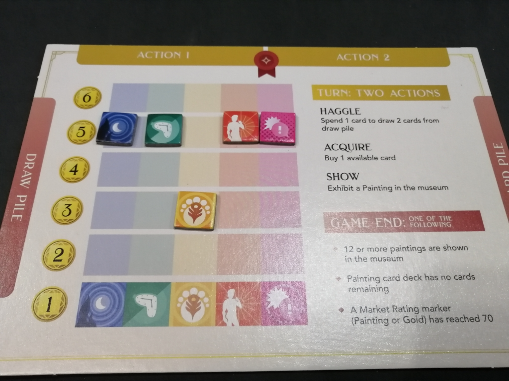 初期デッキは10枚で、お金5枚と絵画5枚。手札は5枚で手番では2アクションまで実行して、手番終了時には5枚になるように手札補充。