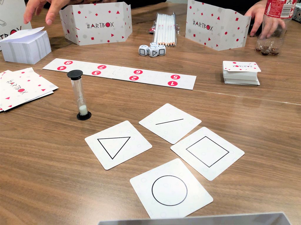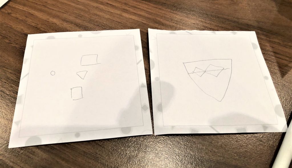 4種類の図形があって、ダイスを振って出た目の図形を出たダイスの個数分書いて、お題を表します。(○2個と△1個と線1本、みたいな)