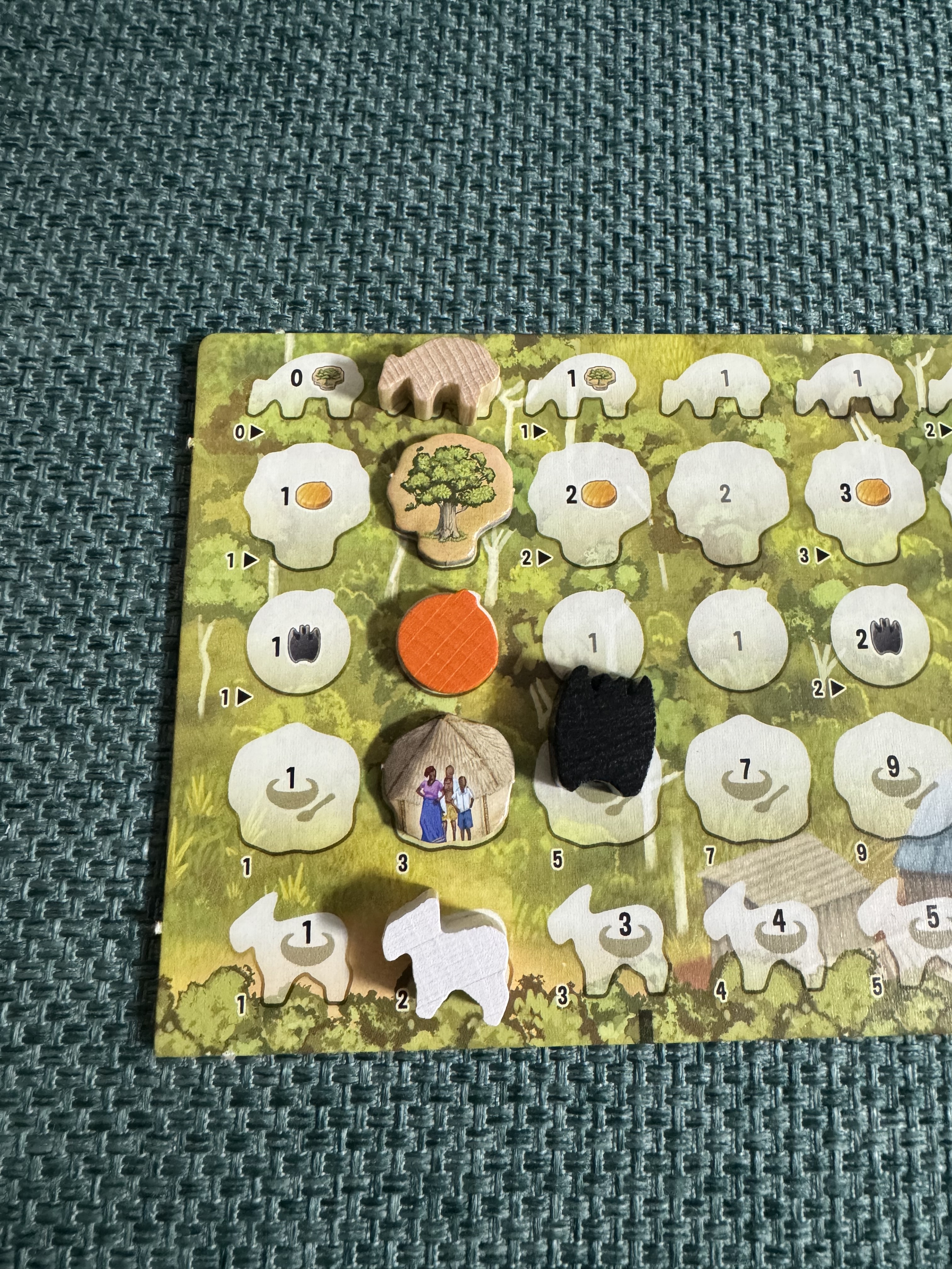 この資材ボード、野生動物(豚にしか見えない…)、木、果物、人、ヤギを管理できます。毎ラウンド終了時にこの手元のボードによって資材が降ってくる仕組みです。