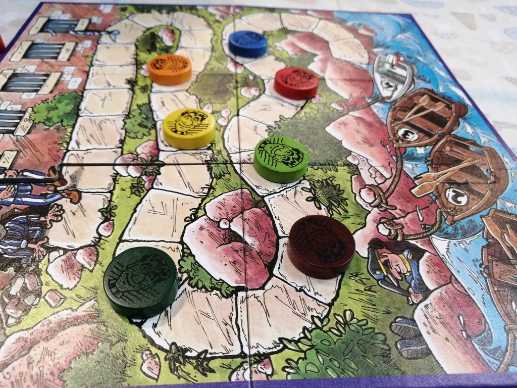 手番がきたら好きな色のダイスを3個振り、出目の数だけ同じ色の脱獄囚を移動させる。どの色から移動させるかは手番プレイヤーが決められて、駒は飛び越えて移動します。
