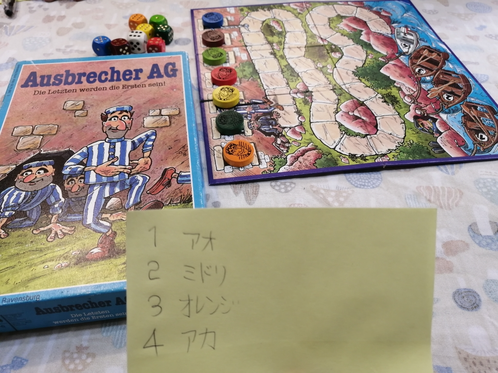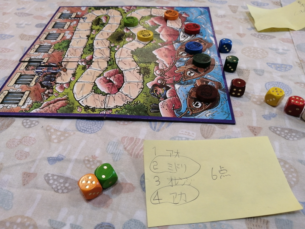 7個中4個の駒が脱出したらゲーム終了で、ゲーム開始時に紙に書いた数字と同じ順位にゴールした駒だけが自分の得点となり合計得点が高いプレイヤーの勝ちになります。