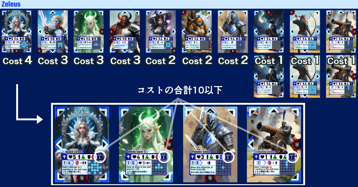 「ゼレウス」陣営のキャラクターのコストの合計が10以下になるようにチームを編成します。(コスト1のキャラクターのみ同じカードが2枚あります。)※コストの合計が10以下であれば、自分の陣地に置ける最大枚数(9枚)になっても構いません。→キャラクターは「ゼレア(コスト4)・エル(コスト3)・ゼノス(コスト2)・ゴードン(コスト1)」を選びました。相手は「カタナ」陣営のキャラクターのコストの合計が10以下になるようにチームを編成します。※ゲーム開始時はAWAKEマークがない方を表にして使います。
