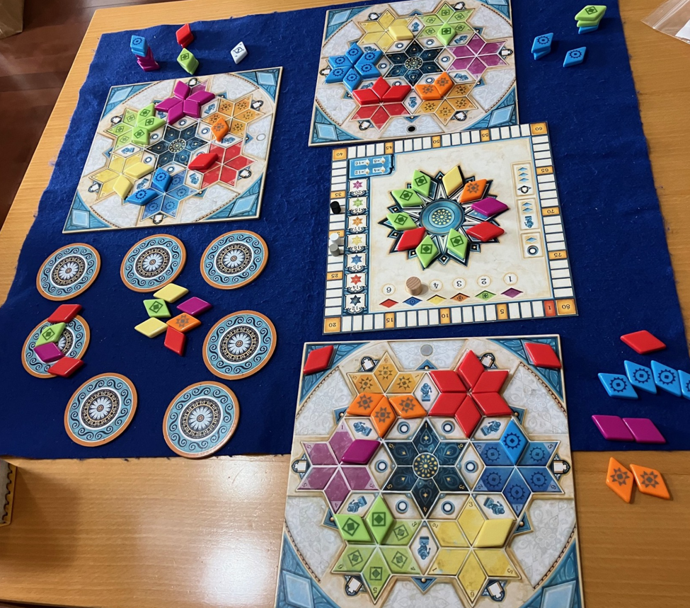 その後、相方は「タイルの触感が好きなのよね」とやりたがっていたのだが、子どもがNoでしばらく放置。先日思い立って2人プレイをしてみたところ、緻密な先読み頭脳戦になり(あれを取ってあそこにこう置いて、そのボーナスであれ取ってあそこにこう置いて、と脳内でキリがない)デッドヒートで僅差の勝負。これまで以上に長考しちゃうし、結構ハードなので、精神統一してまたやろう。