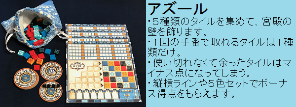 2018年ドイツ年間ゲーム大賞受賞作。5色のタイルを効率集めて自分の宮殿を美しく装飾するゲームです。タイルドローの方式が独特でありこのゲームの魅力が凝縮されている部分です。