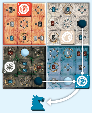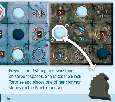 ある聖獣の山を守る石を2つ最初に配置したプレイヤーは、ただちにその聖獣の好意を得ます。聖獣を取り、領域のあなたの側に置きます。