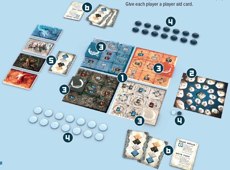 あなたの石を置いて領域から気(カード)と知恵(ポイント)を集め、聖獣を取って助けを借ります。知恵トラックの終端に最初に到達したプレイヤーが勝者です。
