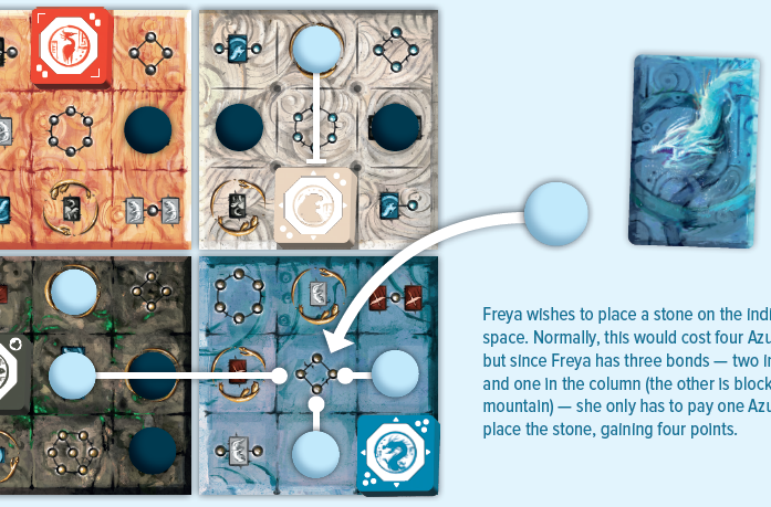 例: フレイヤは図に示されたスペースに石を置きたいと思っています。通常、これには 4 枚の青カードが必要ですが、フレイヤには3つの結合(横の行に2つ、縦の列に1つ(もう1つは山に遮られています) )があるため、青カードを1枚支払うだけで石を配置でき、4ポイントを獲得します。 |