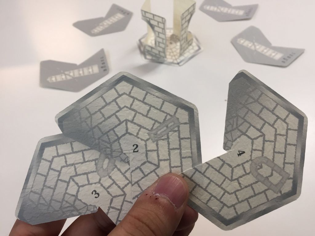 手番プレイヤーは手札3枚のうち1枚を場に公開する。上記図の通り、床カードは半分しかない。他のプレイヤーの床カードを選択し、組み合わさせて正六角形にすることで、床が出来上がる。