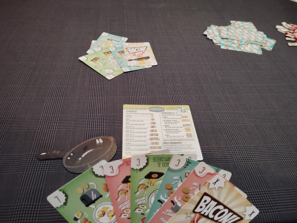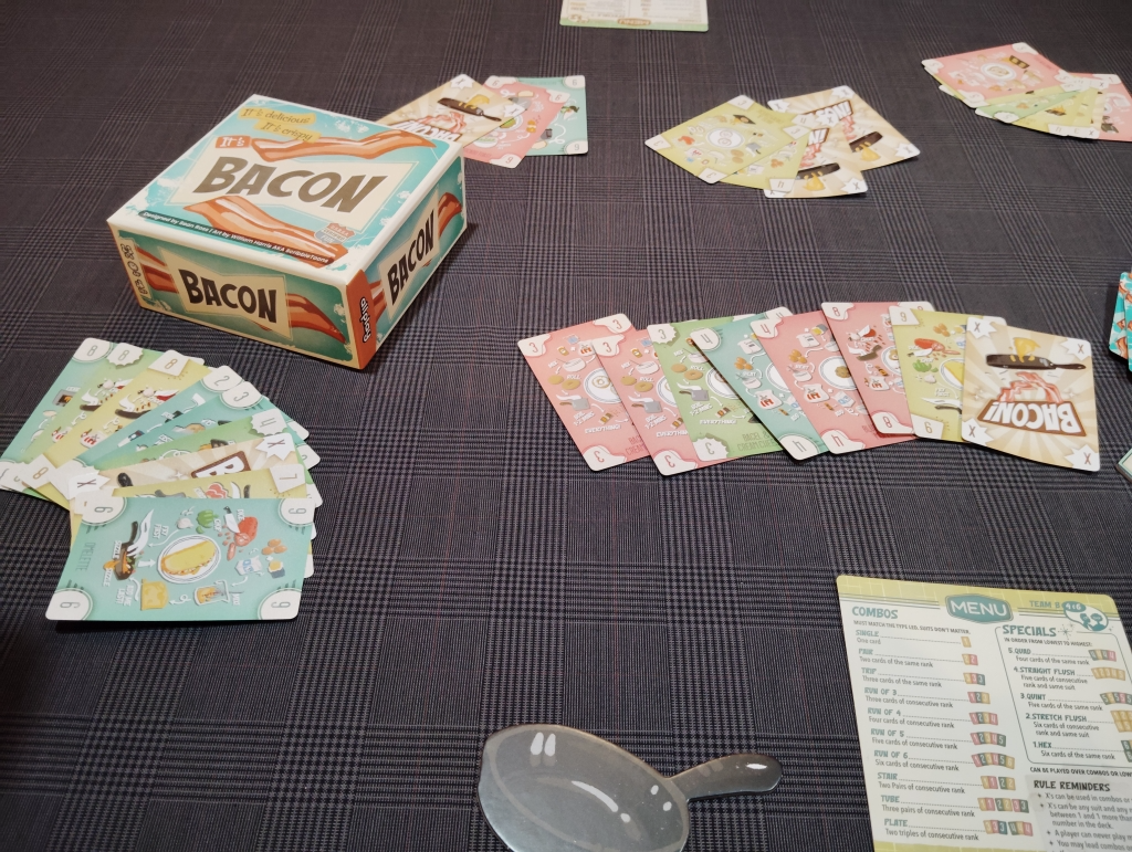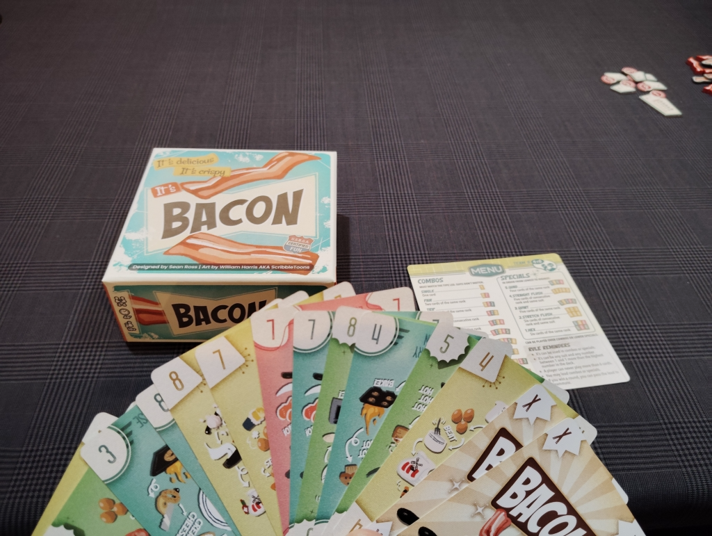 カード4色1〜9の数字カードを各2枚ずつ使用し、ランダムに各プレイヤーに12枚ずつ配り、ジョーカーカードであるベーコンカードを2枚ずつ配り14枚の初期手札でラウンド開始。