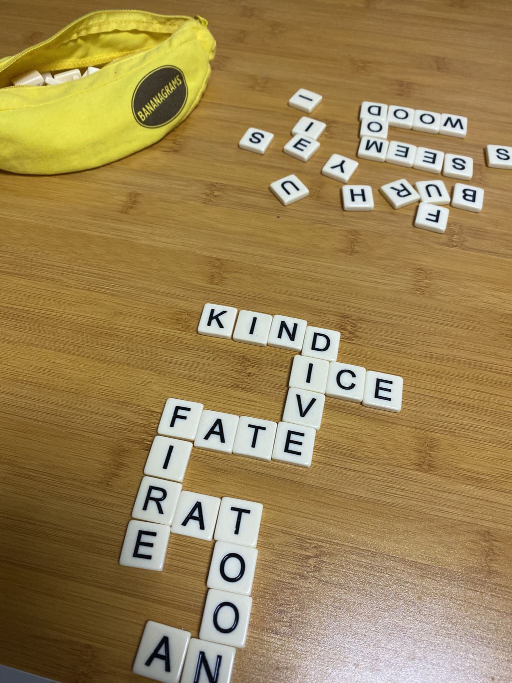 アルファベットのタイルとそれを収めたバナナ状の袋のみというシンプルなコンポーネントに得点計算がないという気軽さ。そして速度と記憶力に語彙力が問われるので短時間でも盛り上がります。