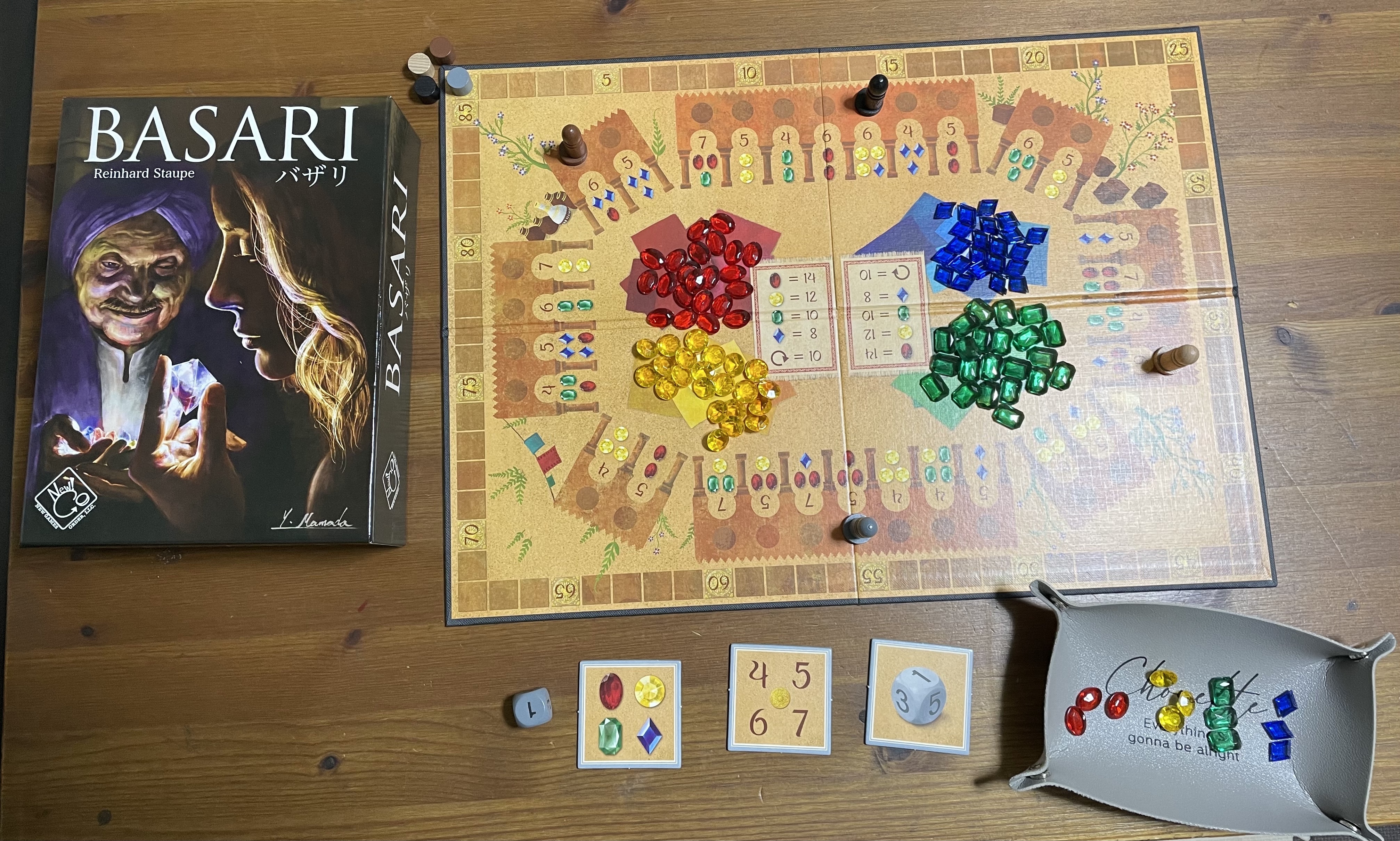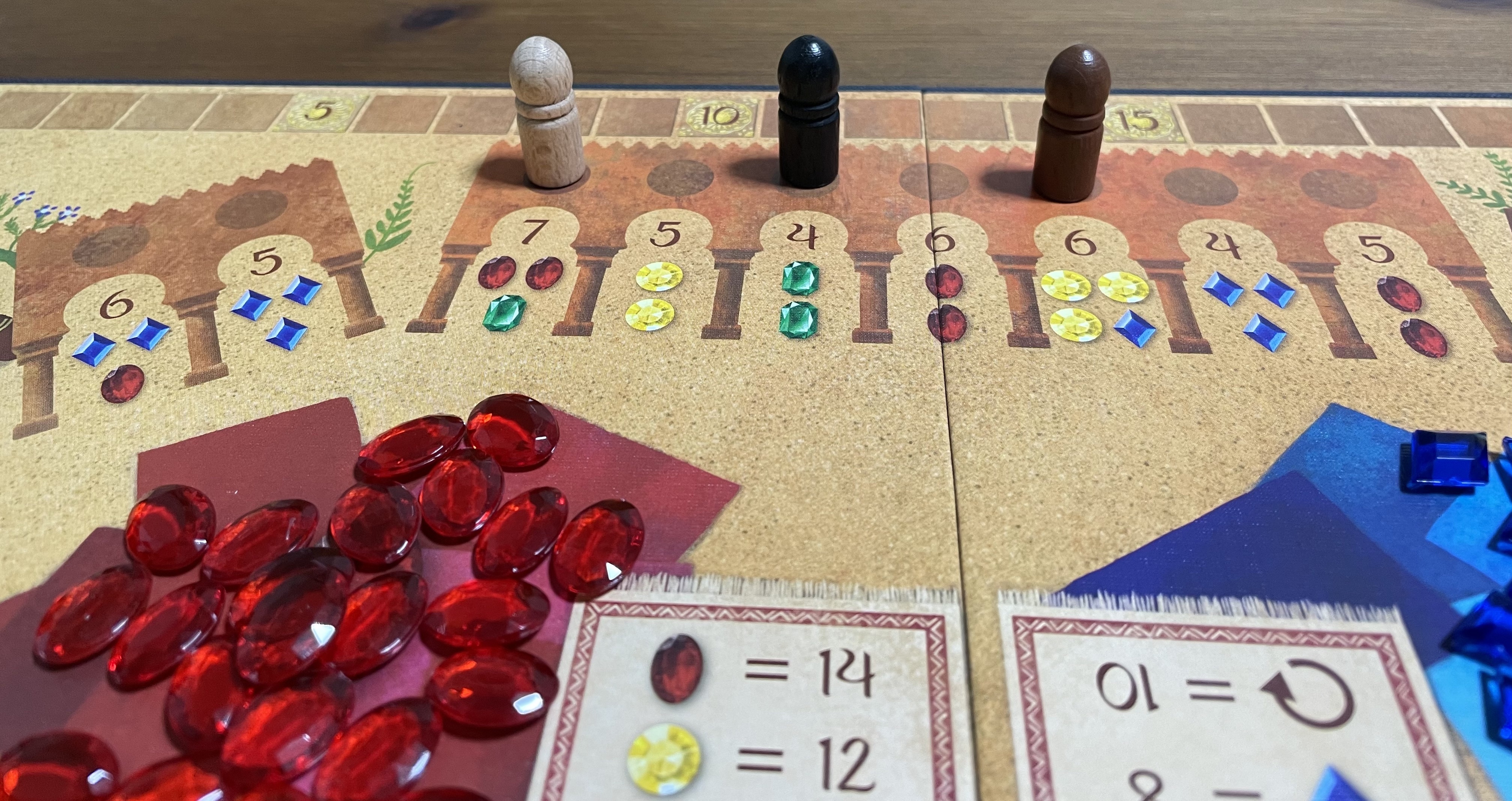 最後に、ラウンド終了時に4種類の宝石それぞれについて、一番多く持っているプレイヤーが8~14点を獲得します。得点を獲得した場合その色の宝石を3個失うので、一位が固定されるようなことも起こりにくいです。