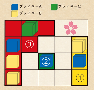 ③はプレイヤーB,Cが同じ数の荷物コマを置いているため、誰も所有していないバショです。