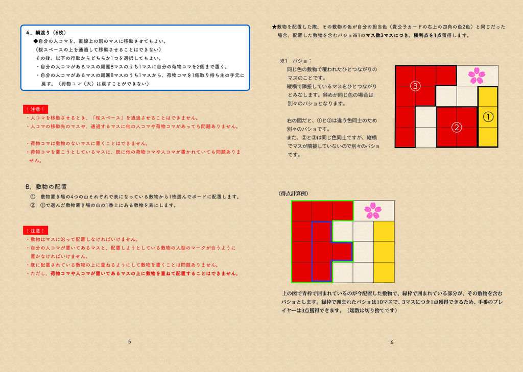 ※バショ:同じ色の敷物で覆われたひとつながりのマスのことです。縦横で隣接しているマスをひとつながりとみなします。斜めが同じ色の場合は別々のバショとなります。