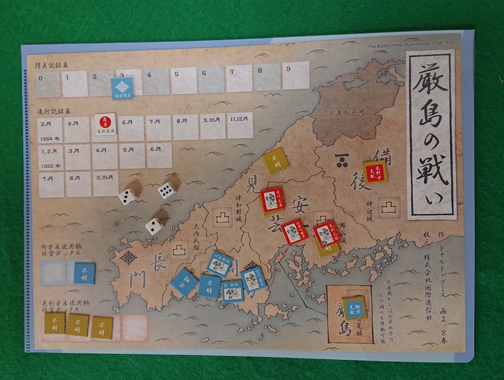 厳島の戦いが決戦となった、毛利元就と陶晴賢の戦いがテーマのゲームです。