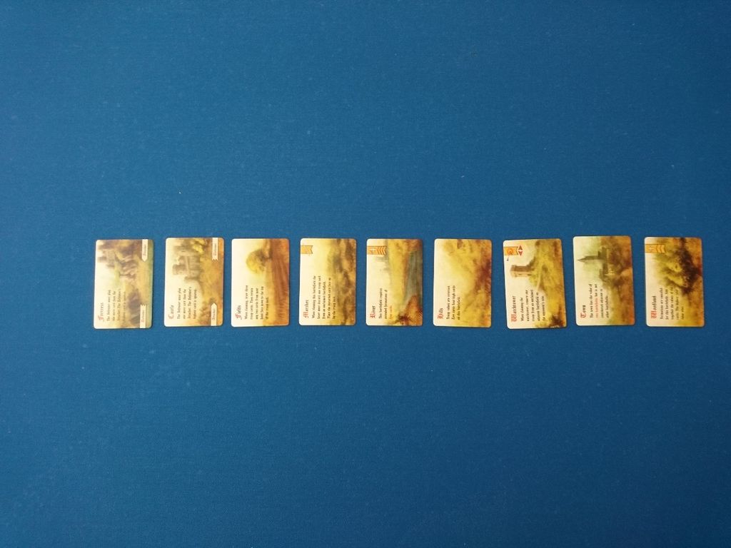 下の画像が、地勢バリアント面で並べた戦場9枚です。地勢バリアントは戦術カードと似たような効果を戦場に付与するというバリアントです。戦術カードの泥濘(Mud)や霧(Fog)なんかは、それぞれ、RiverやWoodlandとして、そのまんまの戦場があります。