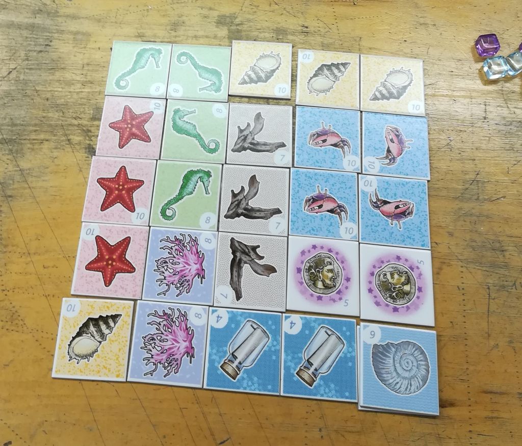 タイルにはそれぞれ、ビンや貝、金貨など枚数の異なる9種類の海岸の漂着物が描かれており、それらを収集してプレイヤーは正方形の標本箱を作ります。