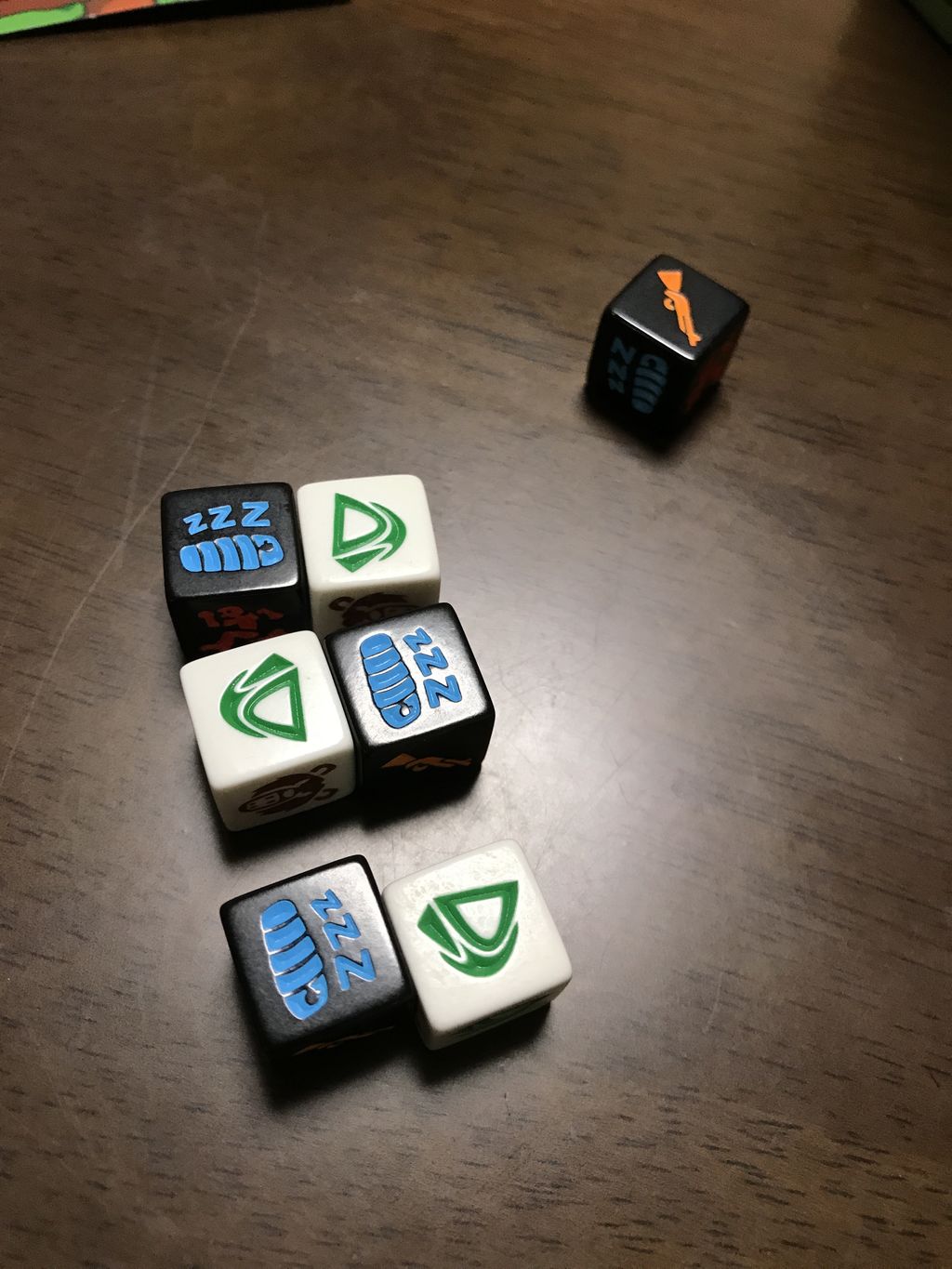 ルールはとても簡単です。一斉に全プレイヤーのダイスと共通のキャンプダイスを振ります。