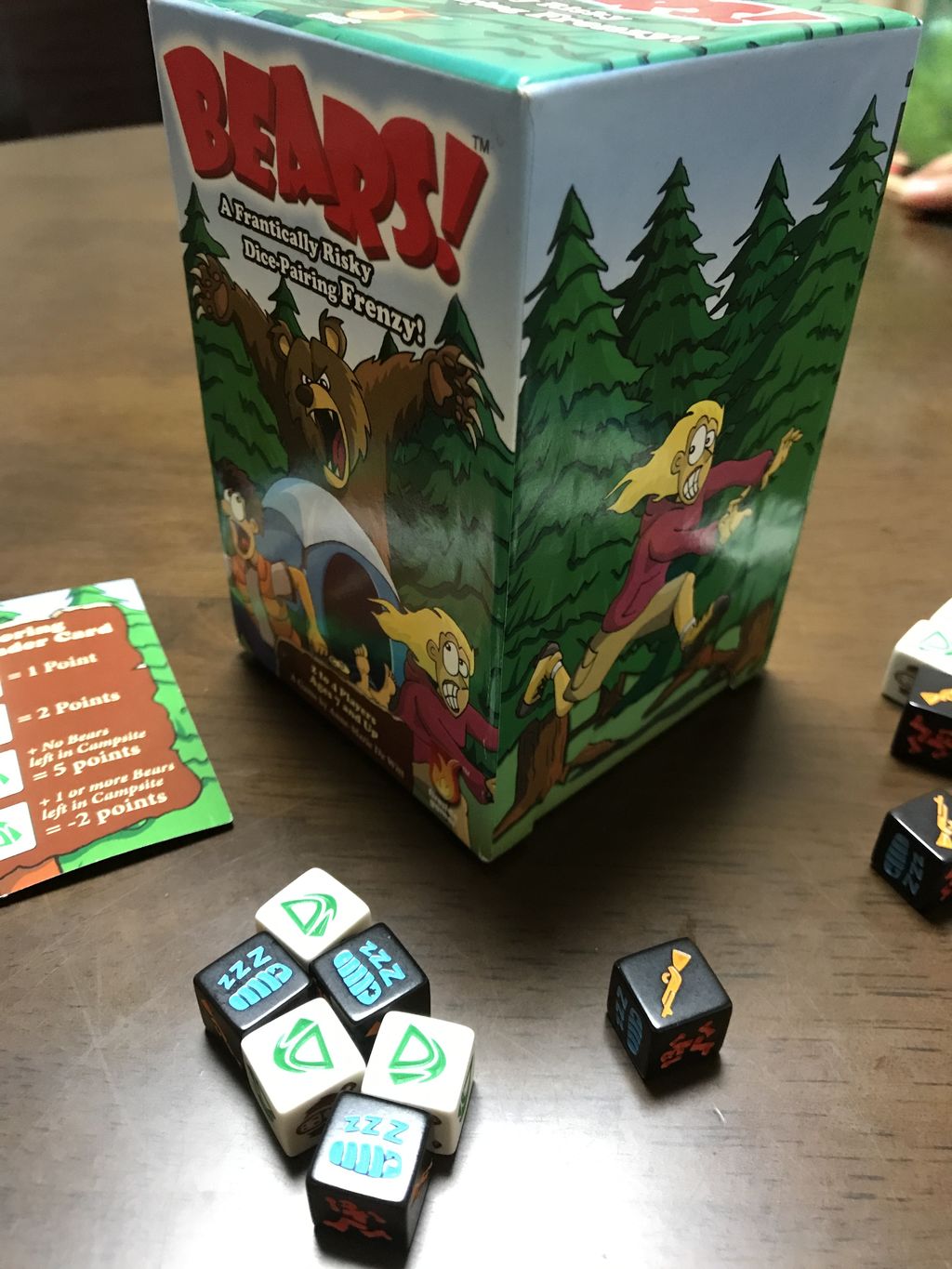 中央のキャンプダイスが、キャンプだけかクマだけになったらゲーム終了。組み合わせによって得点が決まります。