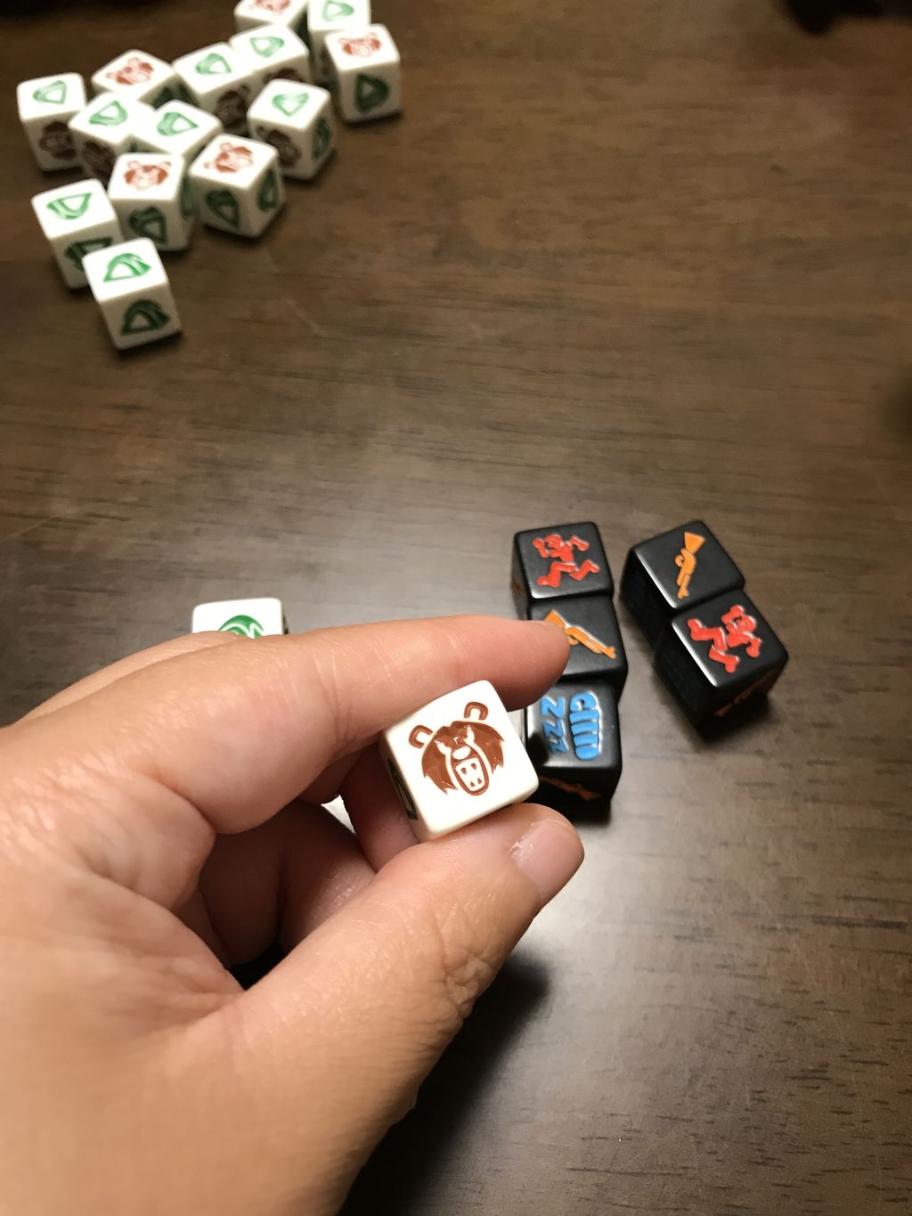 コンポーネントはシンプルで、主にダイスだけ!白いダイスが共通のダイスで、目はクマかキャンプ。クマが出るかどうかの判定って感じですかね。