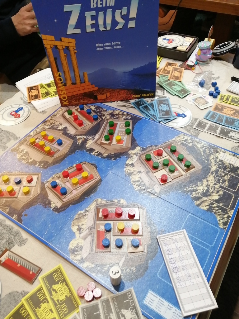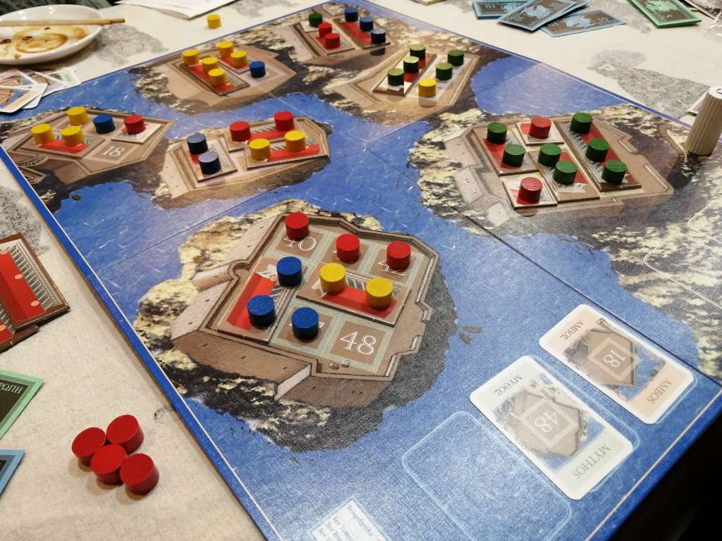 建設した建物に応じた収入を得て、各島で1人だけ建物を建設していたらボーナス収入を得て合計金額が高いプレイヤーの勝ちになります。