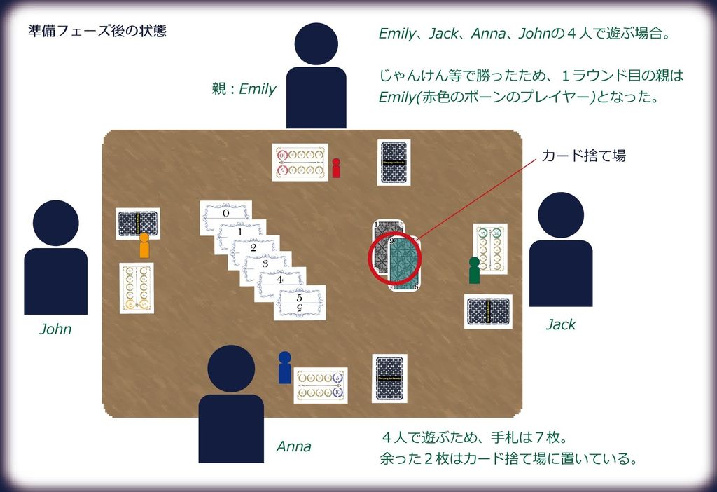 3人の場合は3枚、4人の場合は2枚のカードが余ります。余ったカードは、表を上にして全員が見えるようにテーブル中央に置き、カード捨て場とします。