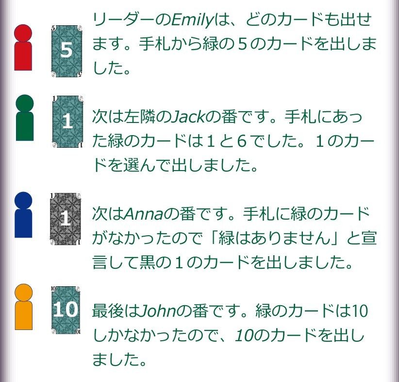 リーダー以外のプレイヤーは、リーダーが出した色と同じ色を持っている場合、必ずその色のカードから1枚選んで出します。