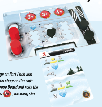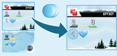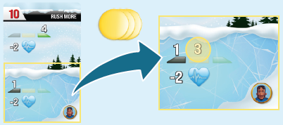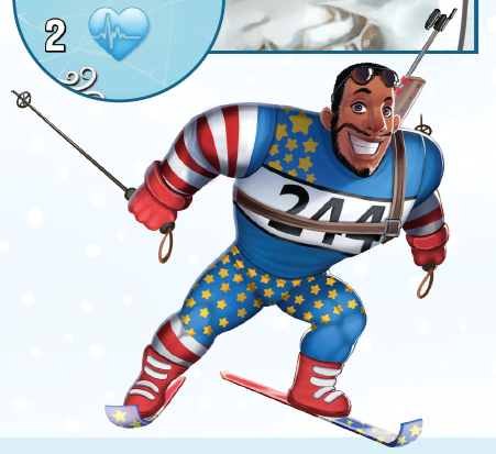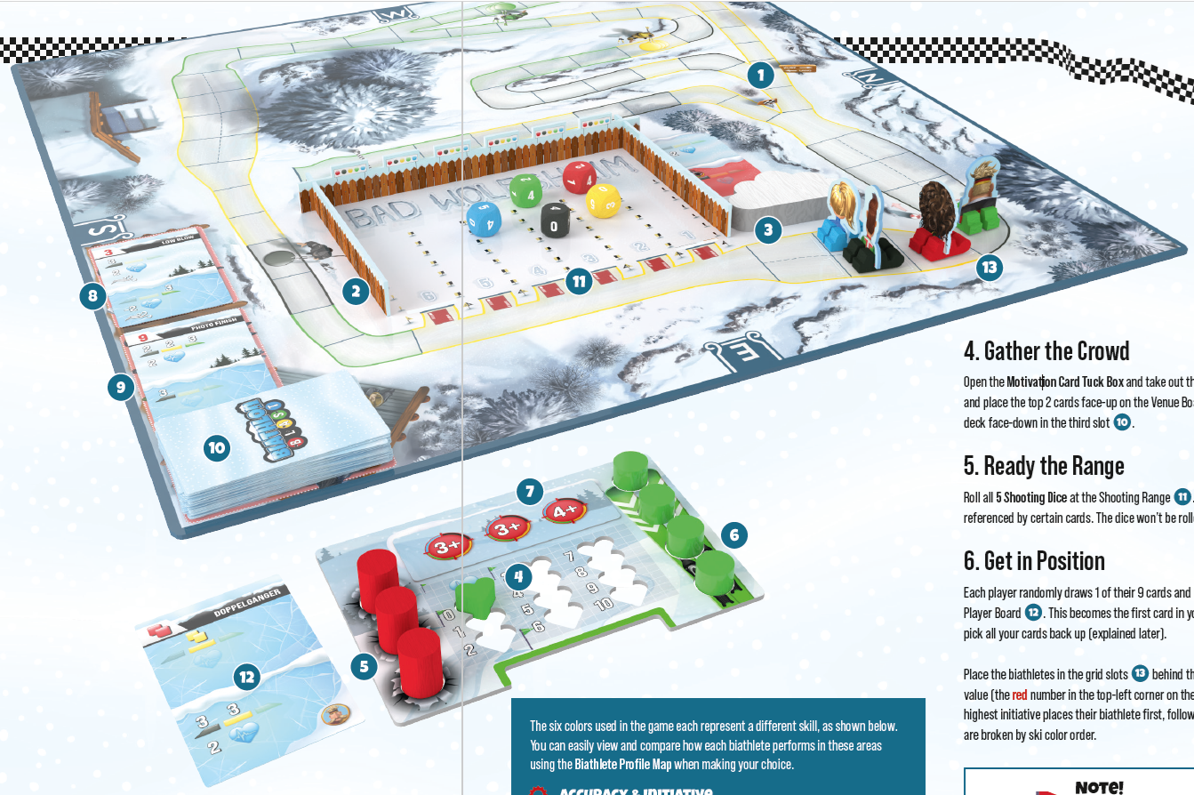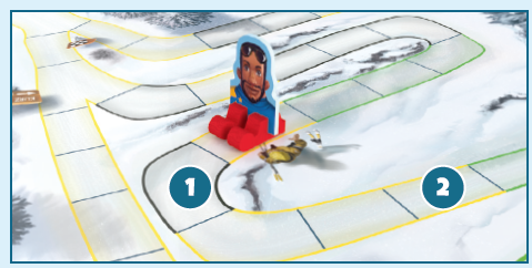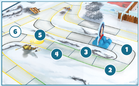 バイアスロン選手をスタートラインの後ろのグリッドスロットに、イニシアチブ値(捨てられたカードの左上隅にある赤い数字)を使用して配置します(13)。最もイニシアチブの高いプレイヤーがバイアスロン選手を最初に配置し、それから次に高いプレイヤーを配置します。同値ならスキー色順で解決します。