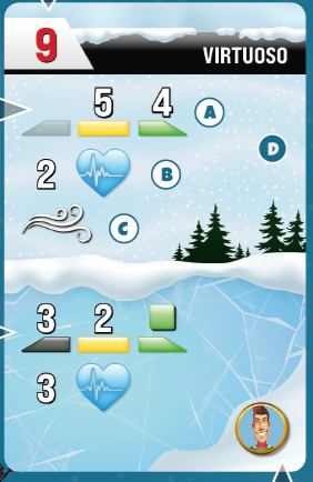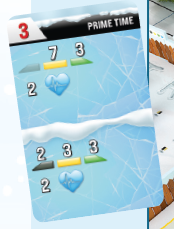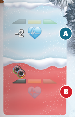 各プレイヤーはスキーペア(同じ色のスキー板2枚)をランダムに引きます。次に、スキーと同じ色のプレイヤーボードと脈拍マーカー、3つの弾丸●を受け取ります。