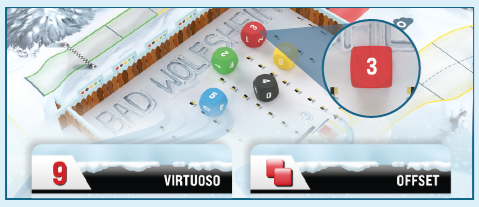 例: 2人用ゲームで、黄プレイヤーはイニシアチブが9のVirtuosoカードを選択し、青プレイヤーはイニシアチブが■■のオフセットカードを選択します。赤ダイスが3と表示されるため、青プレイヤーのイニシアチブは2 × 3 = 6になります。したがって、黄プレイヤーが最初に自分のターンを行います。 |
